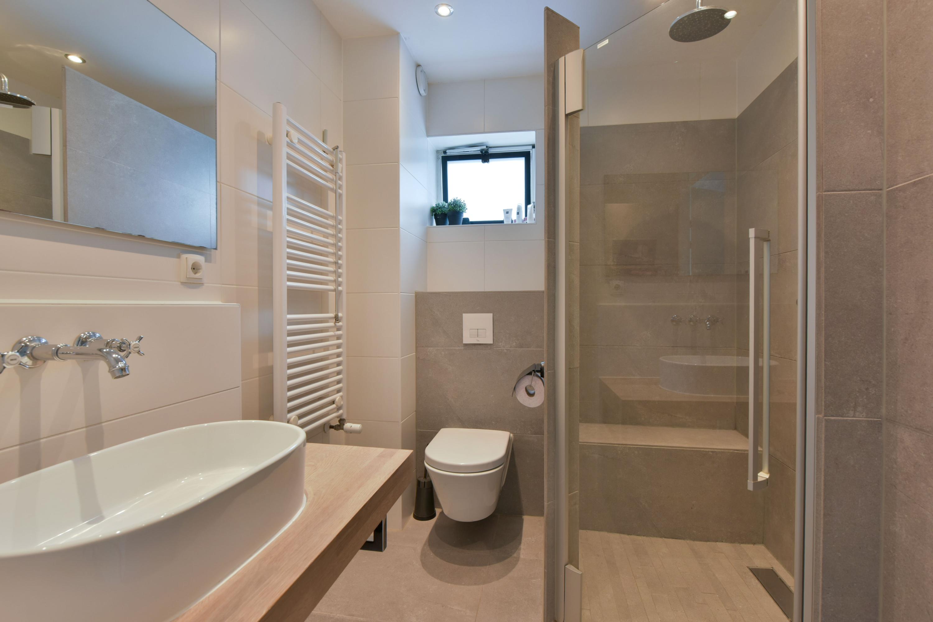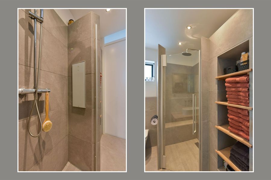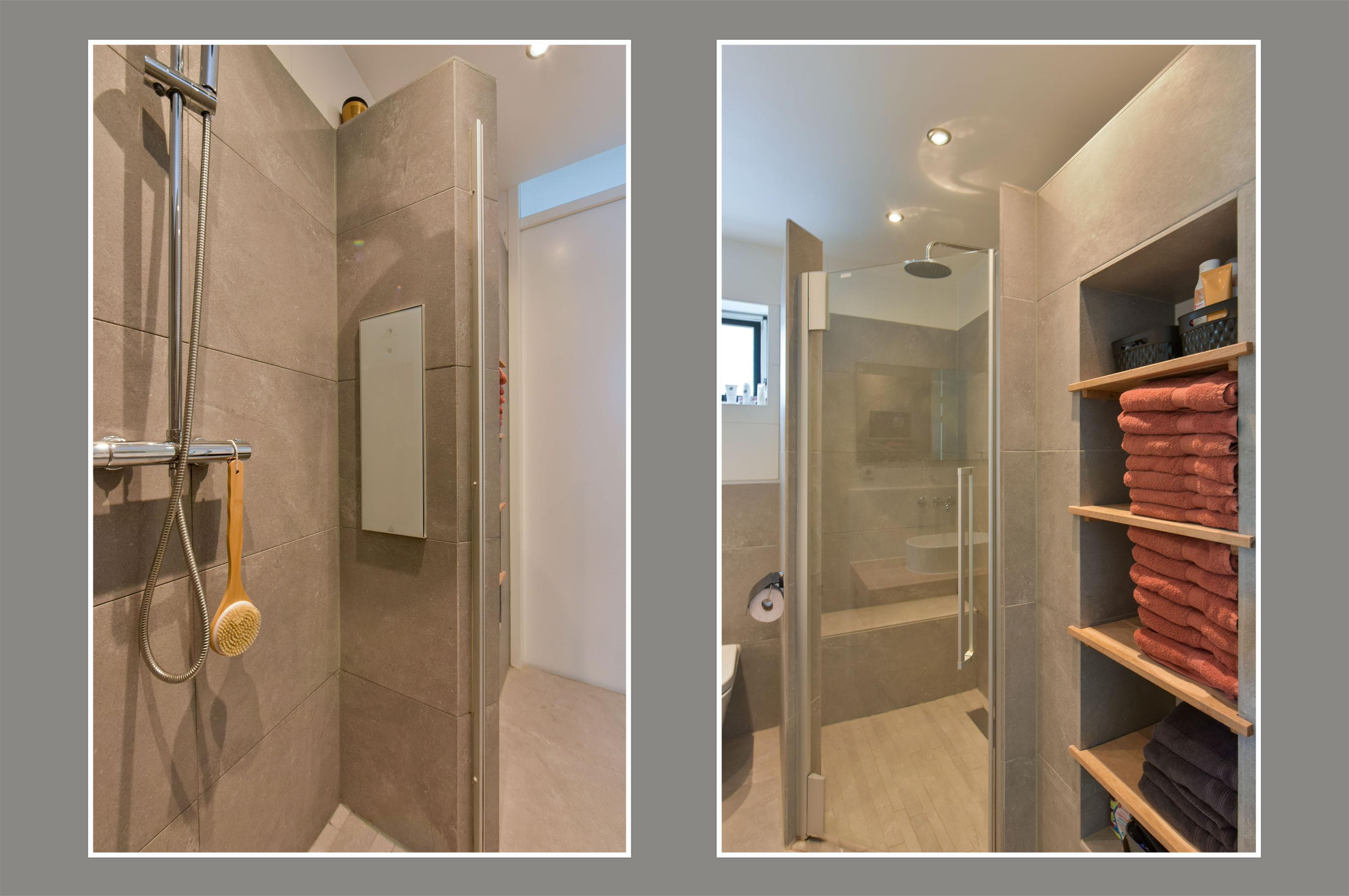 - Badkamer met douche, toilet, wastafel en stijlvolle nisjes;