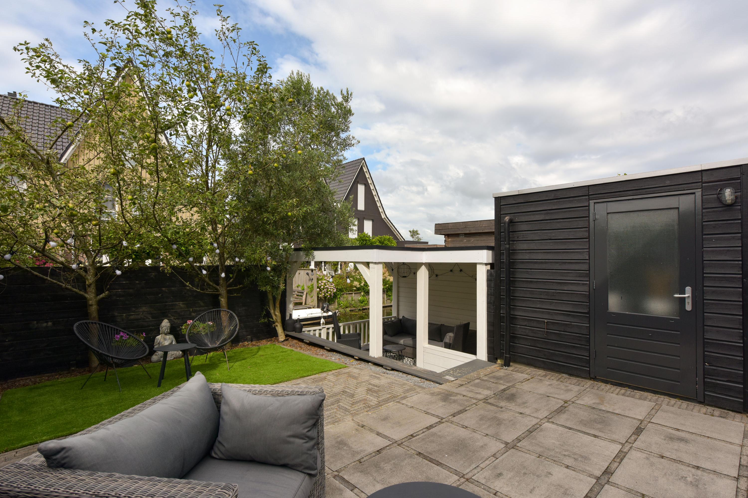 - Tuin aan het water met overkapping, zonnescherm, berging en achterom.