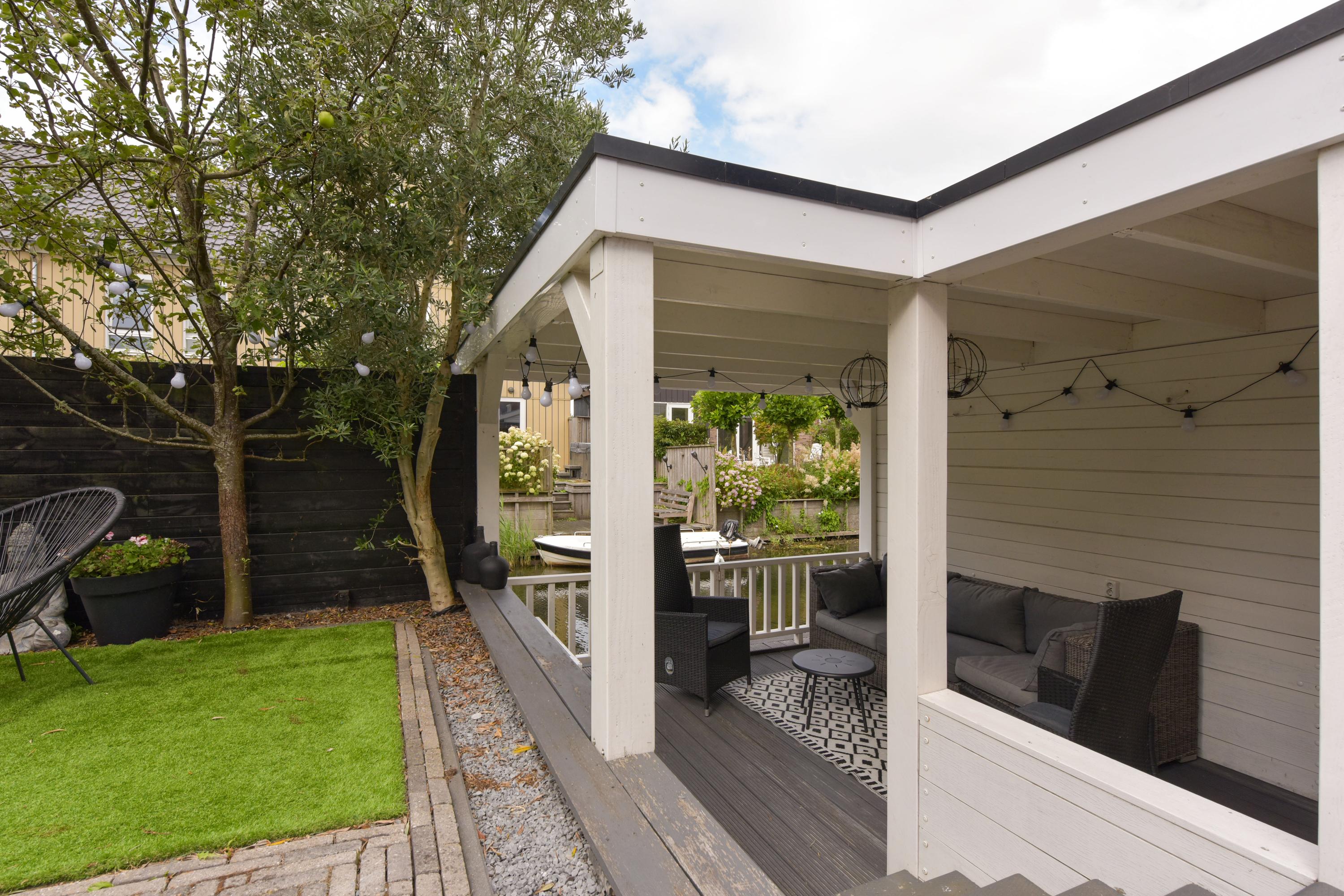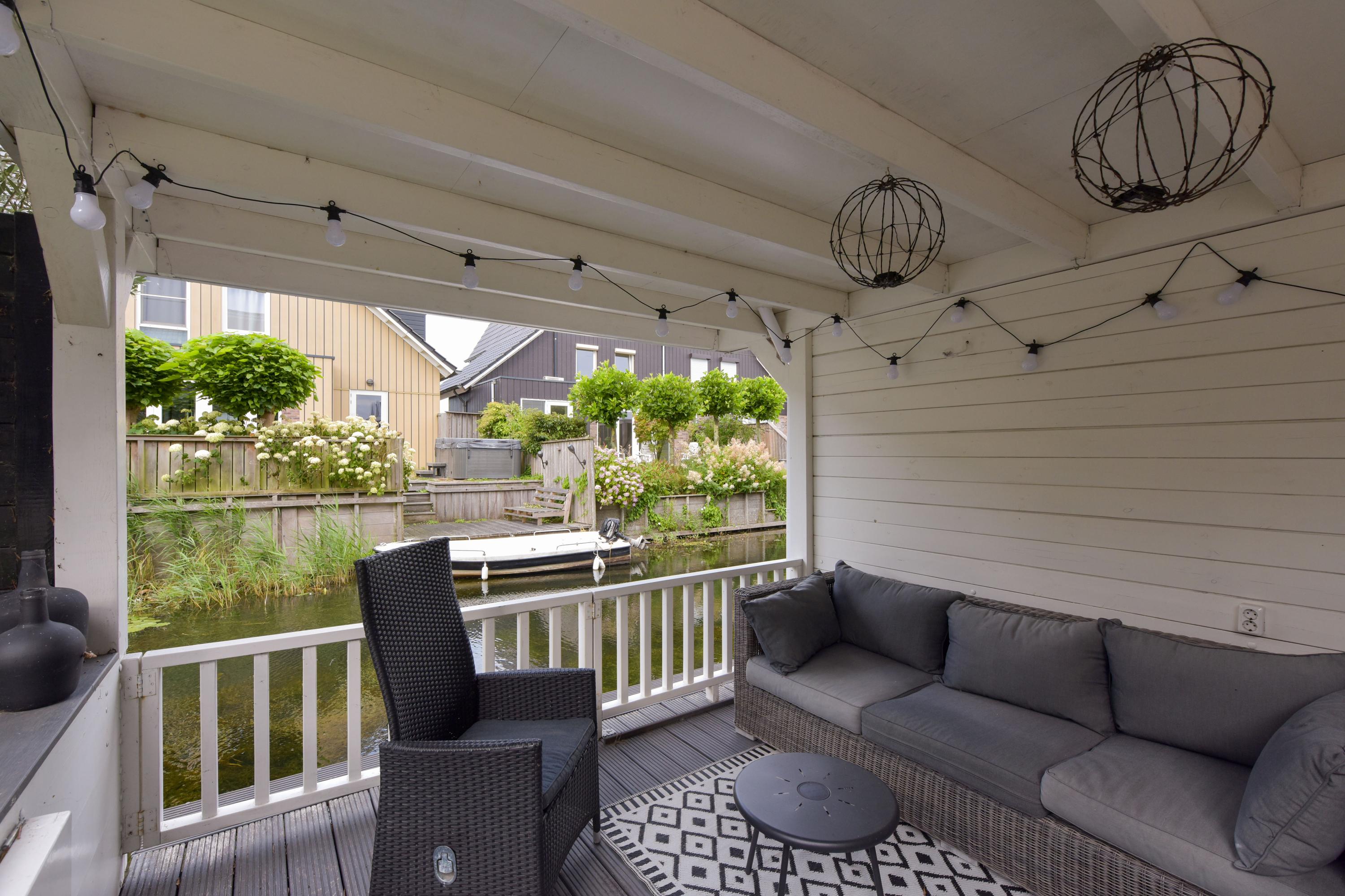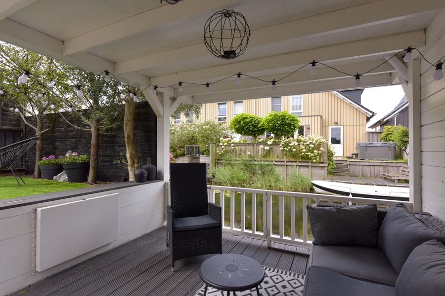 De tuin maakt het plaatje helemaal compleet. Gelegen aan het water, een zonnescherm voor warme dagen én een fantastische overkapping direct aan het water. Hier is het op zwoele zomeravonden écht genieten. Dankzij de berging én achterom is het ook nog eens heel praktisch.
