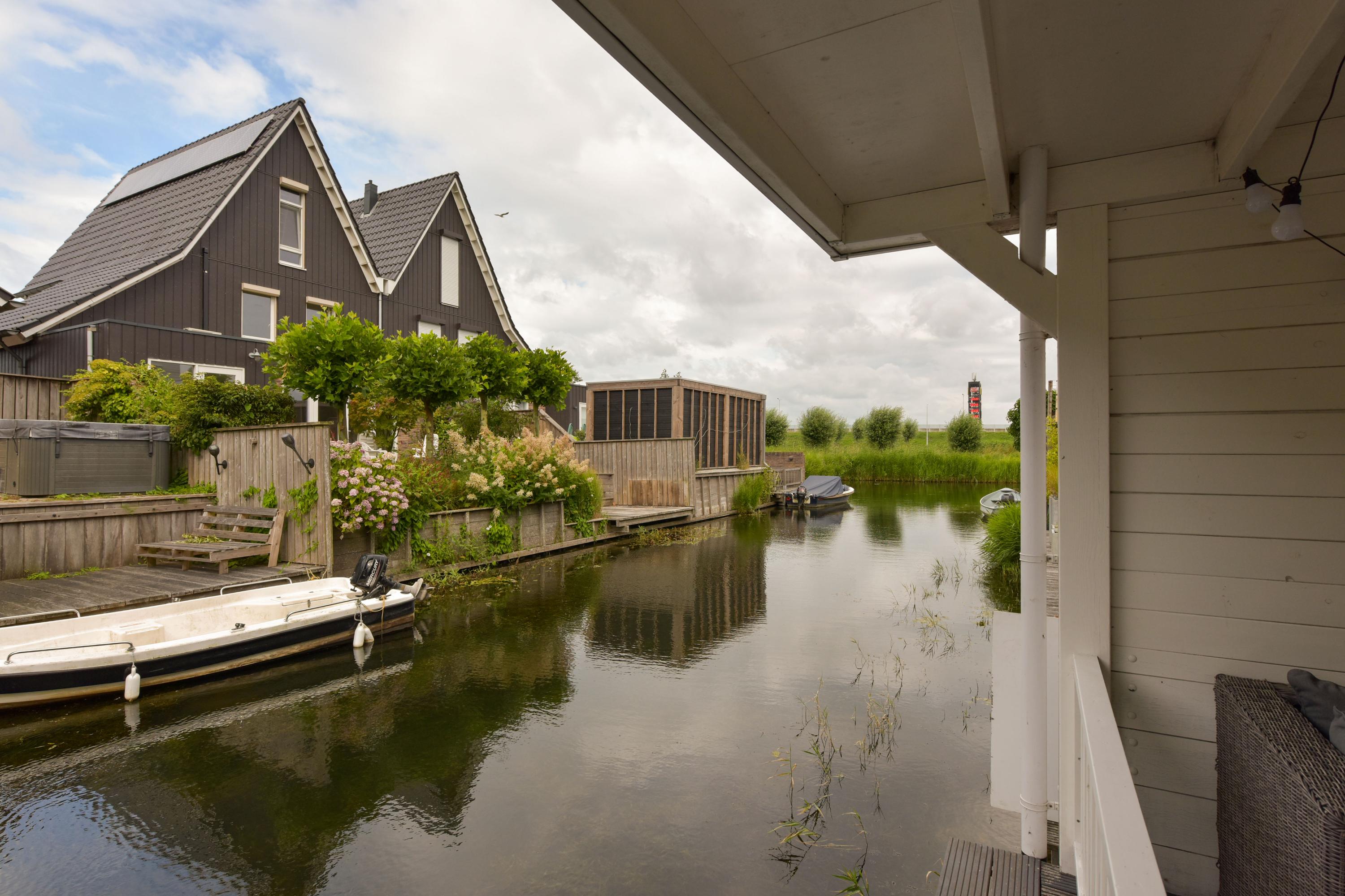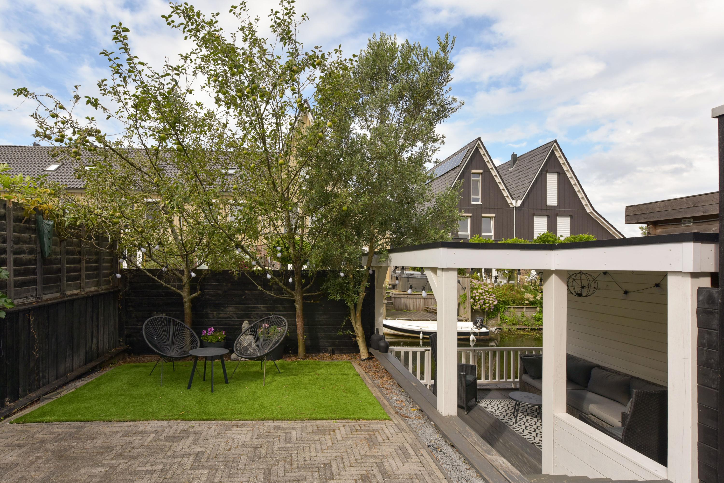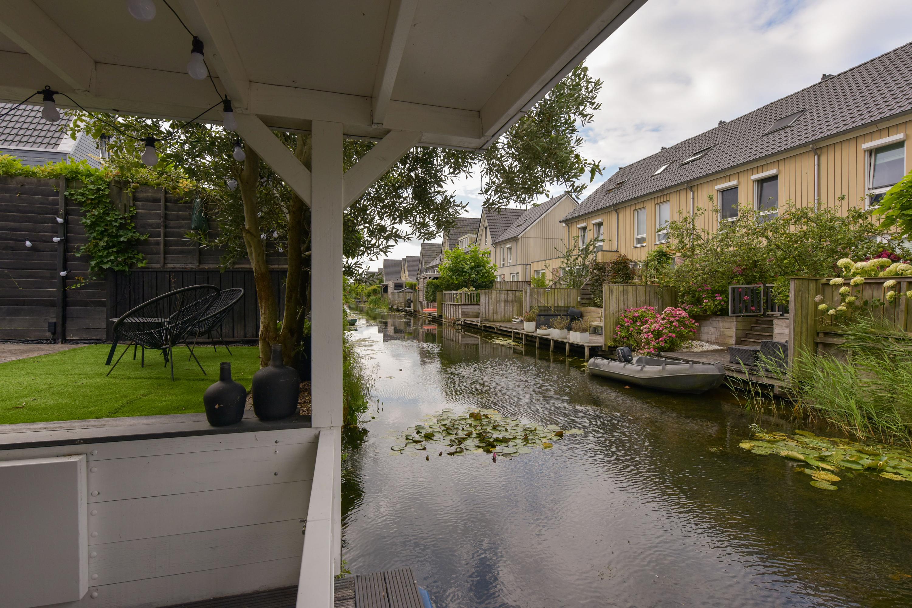 De tuin maakt het plaatje helemaal compleet. Gelegen aan het water, een zonnescherm voor warme dagen én een fantastische overkapping direct aan het water. Hier is het op zwoele zomeravonden écht genieten. Dankzij de berging én achterom is het ook nog eens heel praktisch.