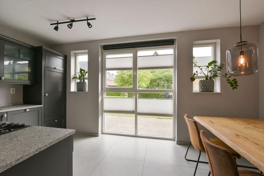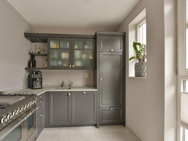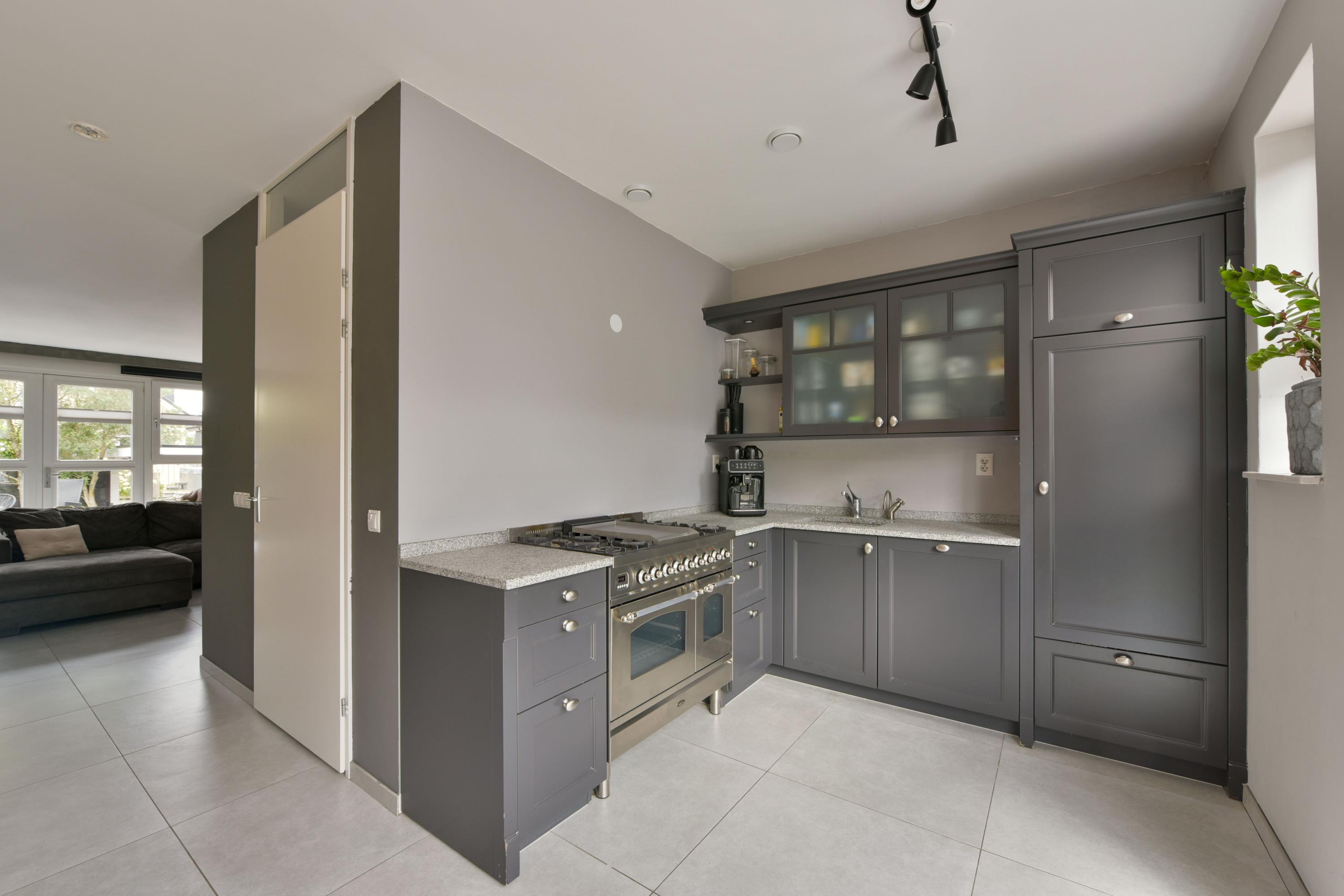De keuken is een echte eyecatcher: strak, stoer en praktisch. Uitgevoerd in stijlvol antraciet met een natuurstenen werkblad en mooi breed kooktoestel met oven. Aan de voorzijde gelegen en voorzien van alle benodigde inbouwapparatuur. Hier kook je met plezier!