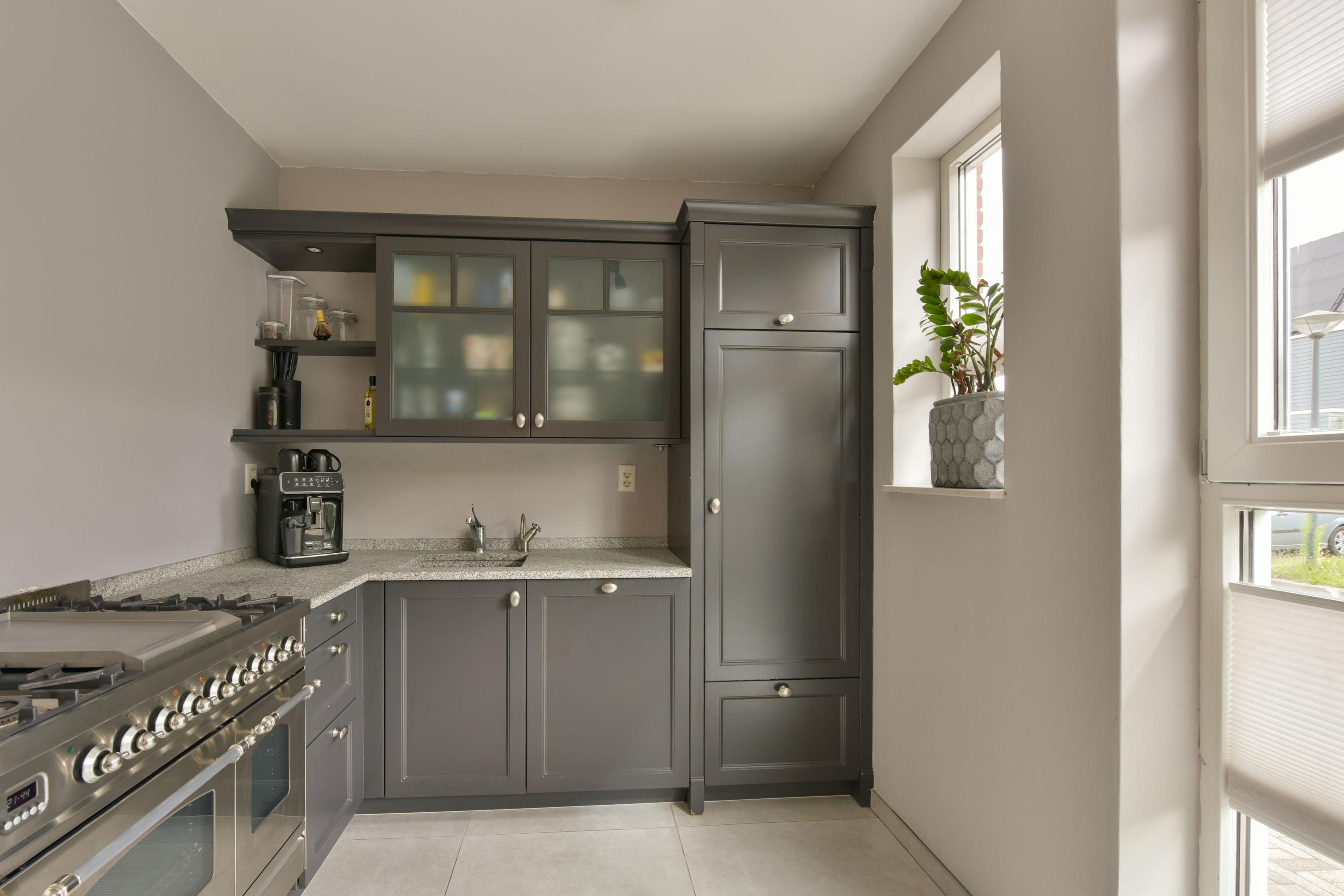- Luxe keuken in antraciet met natuurstenen blad en breed fornuis;